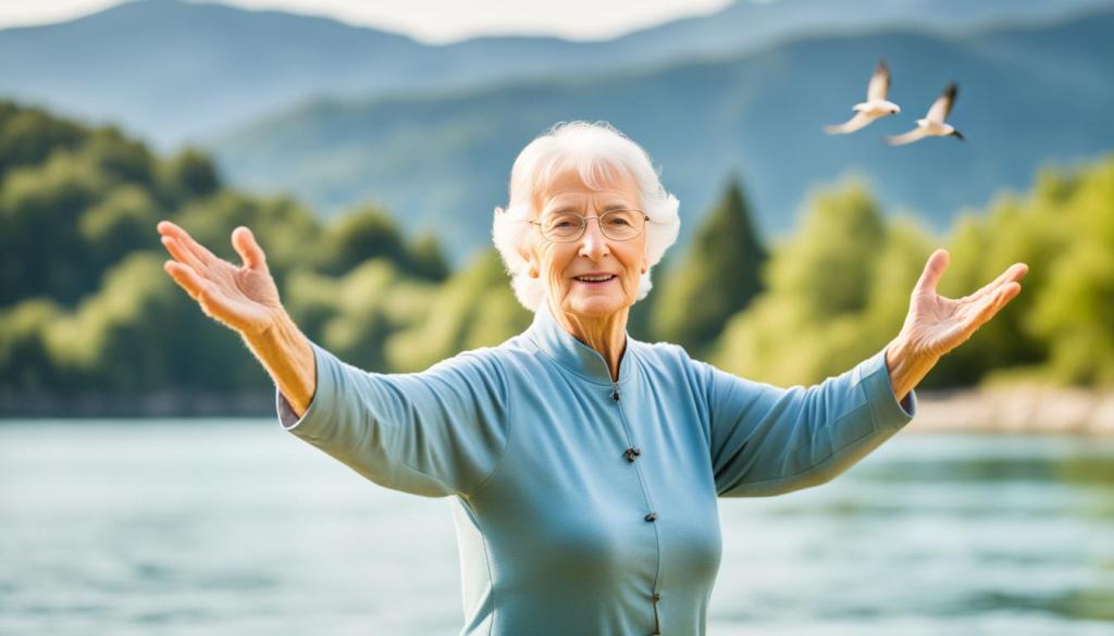 An elderly person gently moving their arms and legs in the flowing movements of Tai Chi amidst a serene natural setting, with birds flying overhead and a calm body of water in the background. The person’s face is relaxed and peaceful, conveying a sense of wellbeing and tranquility.