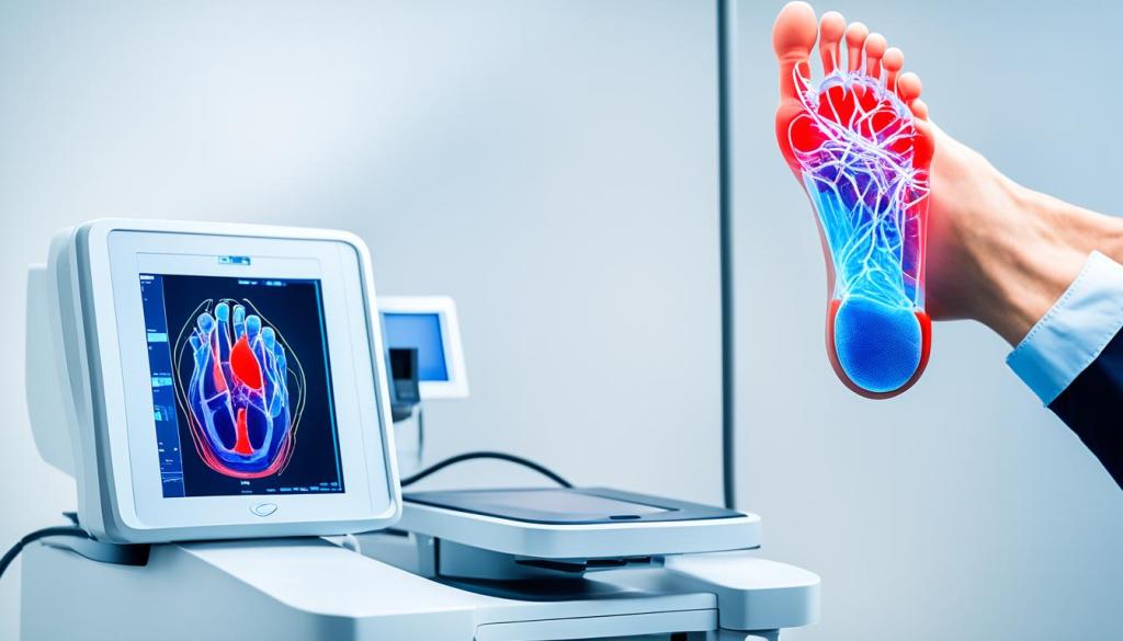 Another test is the ankle-brachial index (ABI) test. It compares blood pressure at your ankle and arm. A low ABI value means a higher chance of PAD, showing poor blood flow to your legs.