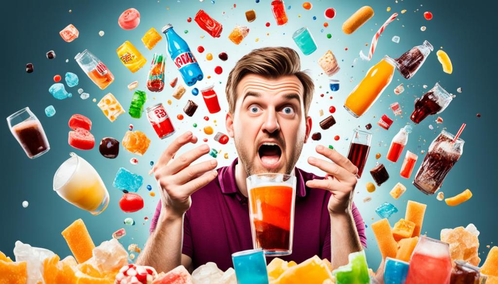 Sugary drinks also affect your blood sugar. They cause a quick rise in blood sugar, followed by a drop. This leaves you tired and wanting more sugar. It’s a cycle that can lead to eating more unhealthy foods or drinks, making your health worse.
