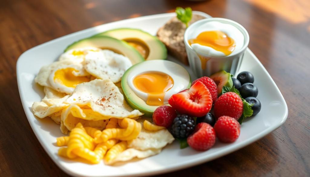 - High-protein options such as eggs, Greek yogurt, or cottage cheese