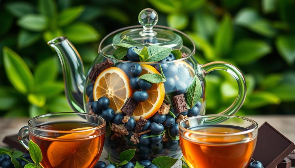 Tea varieties offer great tea benefits for brain health. Green tea is especially good, thanks to its polyphenols and flavonoids. These help improve memory and mood.