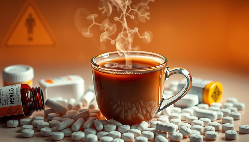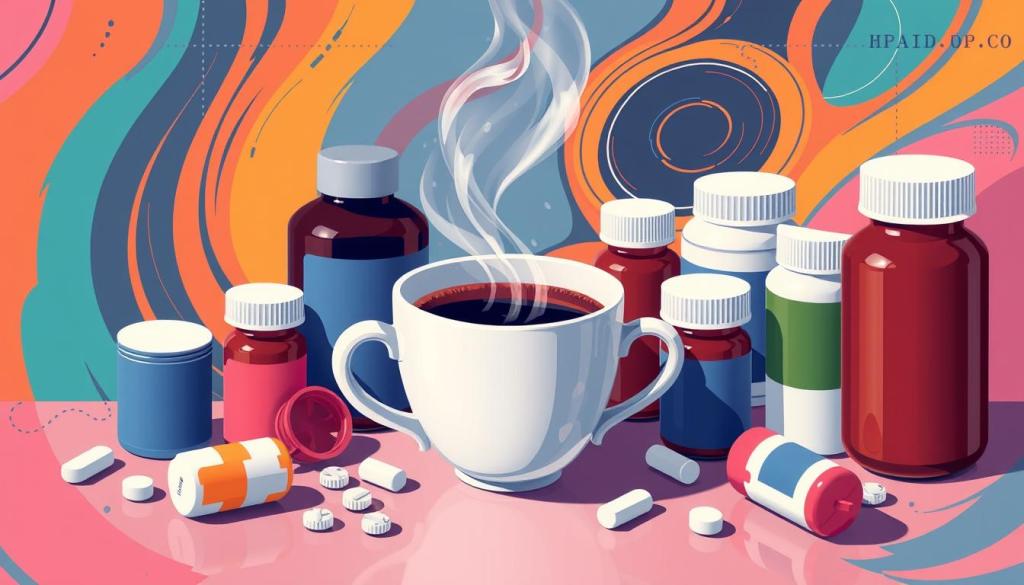In the U.S., over 37 million people have diabetes, and about one in ten take antidepressants every day. It’s key to know how coffee can affect these medicines. For example, coffee can cut the absorption of thyroid medication by more than half. It can also impact Alzheimer’s drugs, making them less effective. By understanding these interactions, you can make choices that keep you healthy.