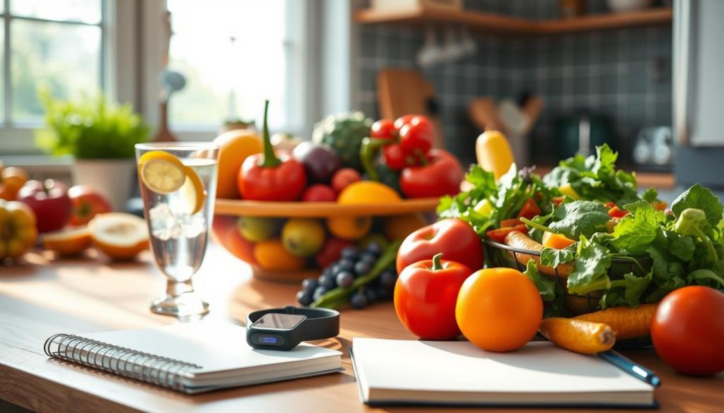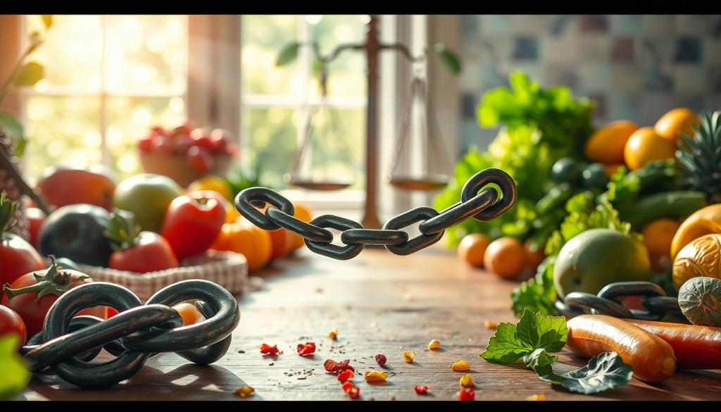 Being kind to yourself is also crucial. It’s okay to slip up sometimes. Learning to handle these moments without quick fixes helps you make lasting changes. By eating mindfully and eating a variety of foods, you’re more likely to break bad habits. Having support from programs or friends can also help you stay on track.