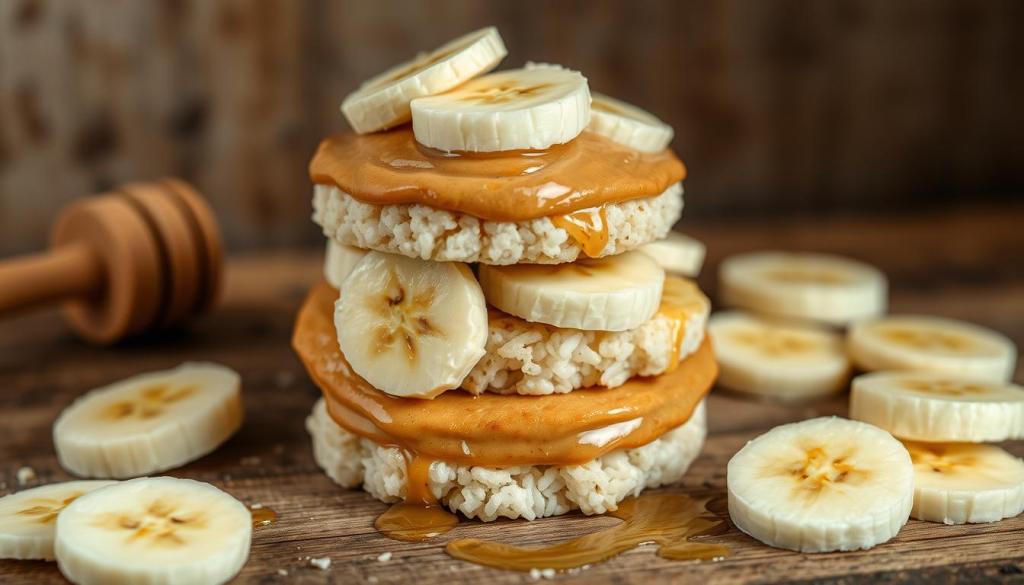 Rice cakes with peanut butter and bananas are a tasty and healthy snack. They mix complex carbs, healthy fats, and natural sugars. This combo keeps you full and energized between meals.