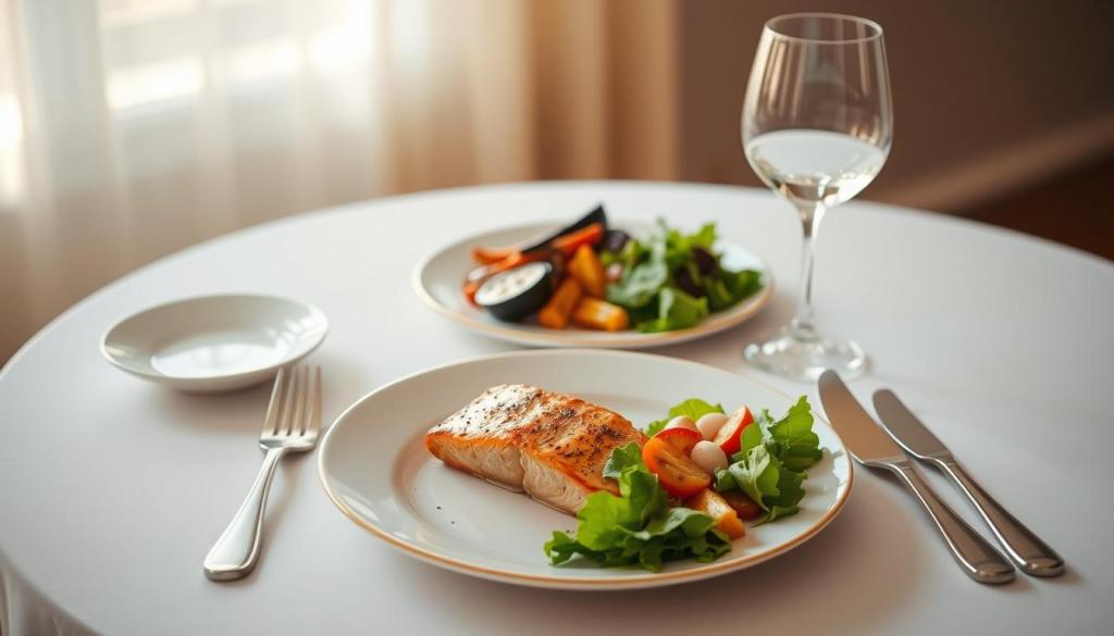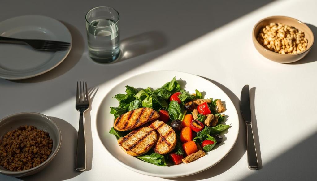 When it comes to strategic eating for weight loss, finding the right meal timing is key. Everyone’s schedule and needs vary. A meal plan that fits your life can greatly help with weight loss. For example, eating a balanced breakfast before work and a healthy lunch at your desk can give you energy and aid in weight loss.