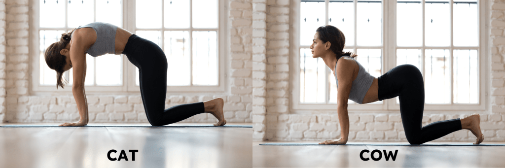 - Start with the Cat-Cow pose to warm up and loosen your spine